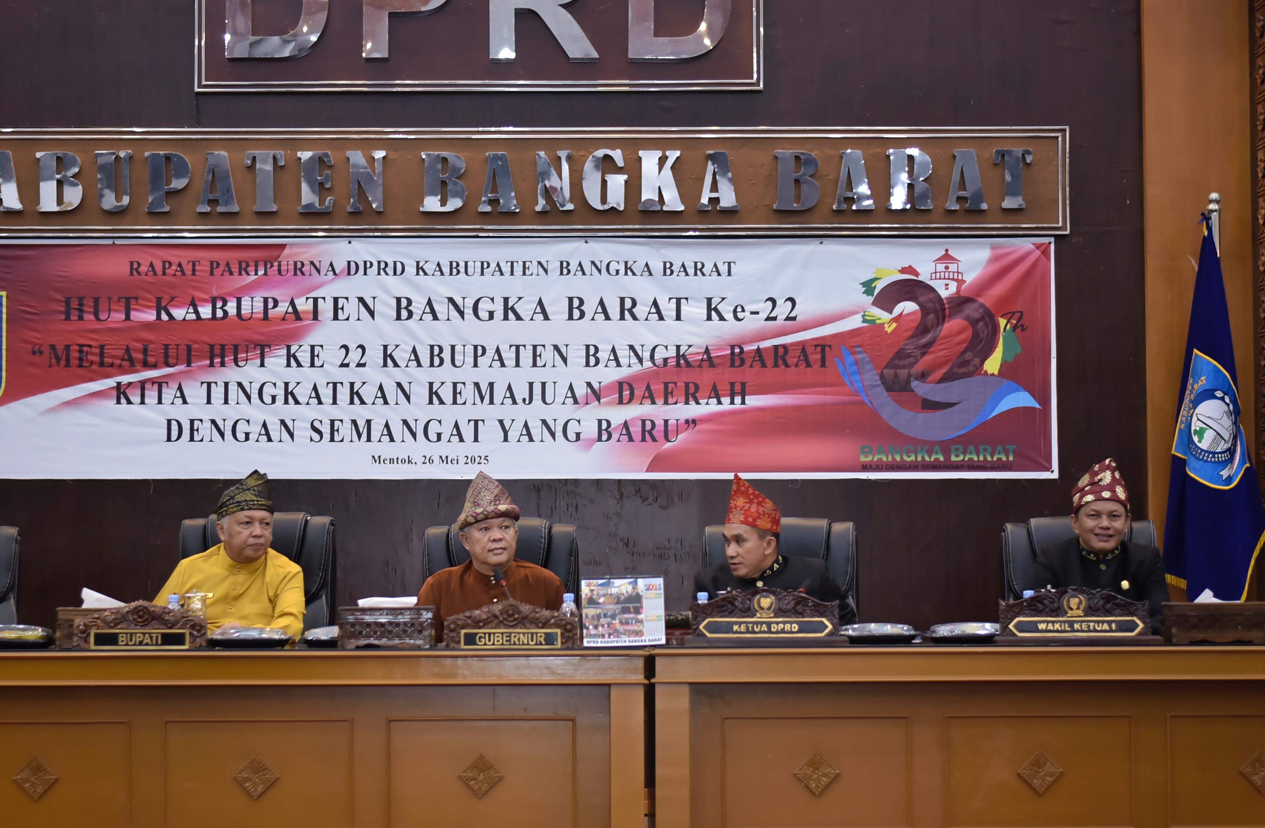 BANGKA BARAT - DPRD Kabupaten Bangka Barat menggelar rapat paripurna istimewa memperingati hari ulang tahun ke-22 Kabupaten Bangka Barat di Gedung Mahligai Betason II, pada Senin (27/5/2025).